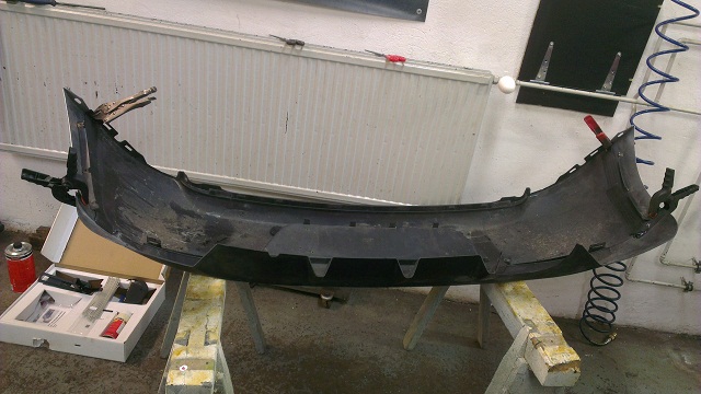 Und zwar haben wir das Ganze mit Stoßstangen-Reparatur-Kleber geklebt und mit Sicherheitsgurtstreifen verstärkt. Soll extrem gut halten, da bin ich mal gespannt