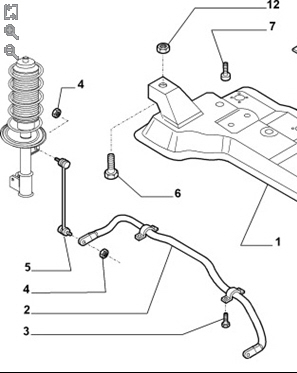 Da habe ich festgestellt, dass die Gummilagerungen der sogenannten Drehstabfeder (die Stabi-Strebe über der Vorderachse, an der die Koppelstangen befestigt sind - im Bild, die Position 2) wohl ausgeschlagen sind.